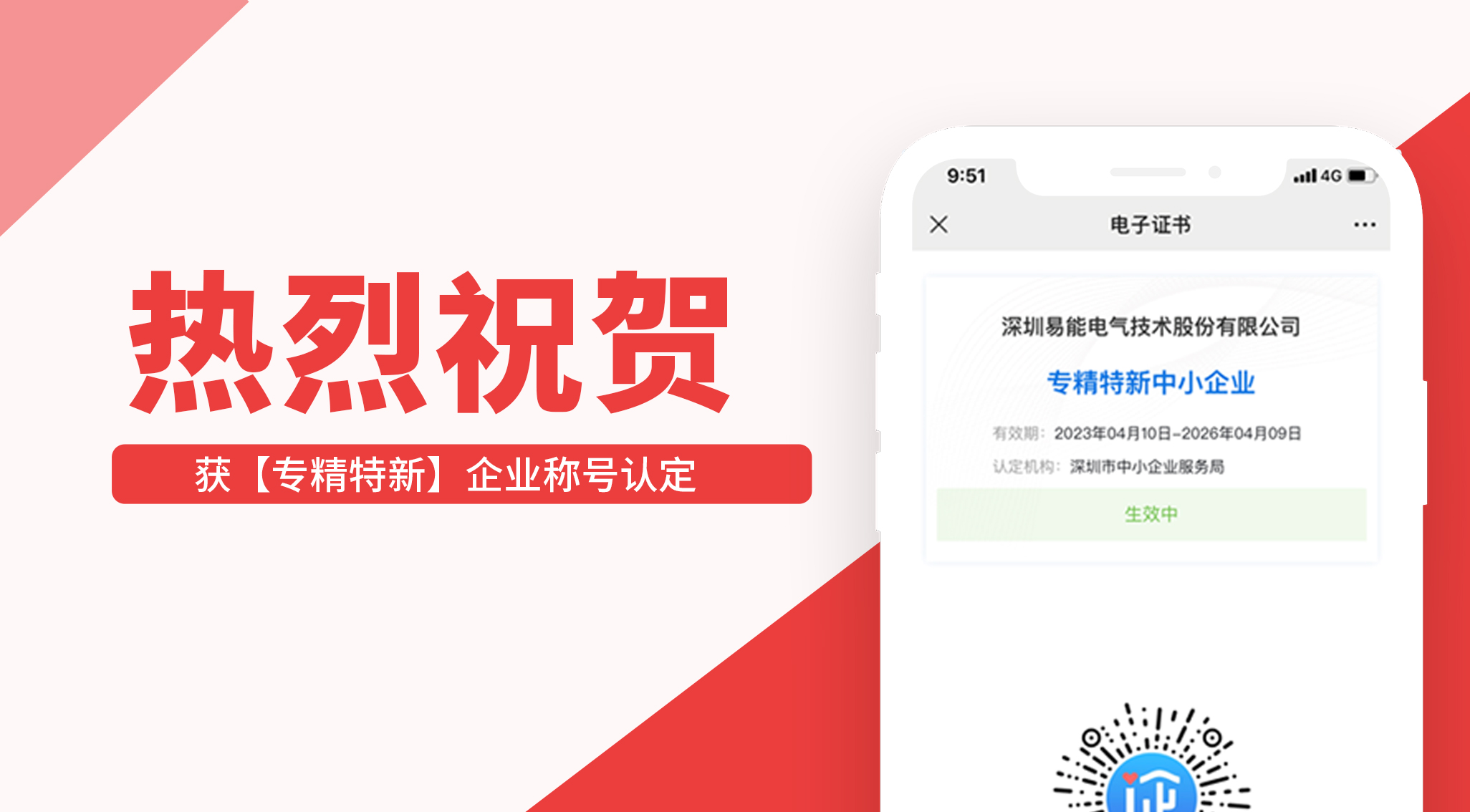 據(jù)深圳市“專精特新”中小企業(yè)名單公示,易能電氣憑借專業(yè)技術水平,創(chuàng)新能力等綜合實力成功獲評深圳市“專精特新”中小企業(yè)稱號。